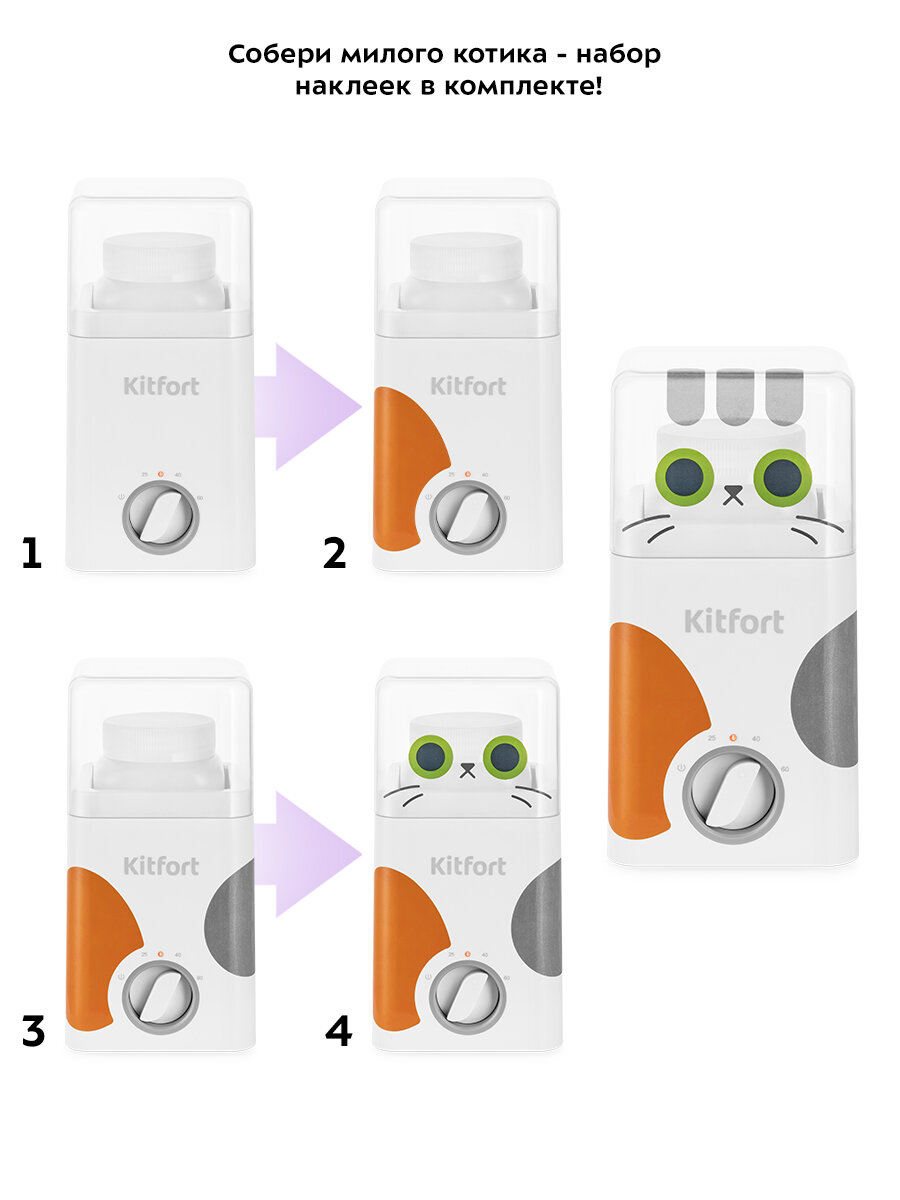 В комплекте с йогуртницей КТ-4064 идёт набор наклеек для создания образа милого котика. Каждая деталь пронумерована для соблюдения последовательности нанесения. В любой момент их можно отклеить - наклейки не оставляют следов на поверхности.