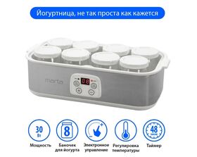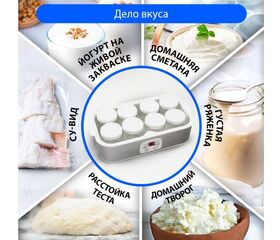 Отличный прибор для каждодневного приготовления живых йогуртов, кефира, ряженки, простокваши и других молочнокислых продуктов в домашних условиях без красителей консервантов и стабилизаторов. Комплект из 8-ми 180-граммовых стеклянных баночек с крышками надежно сохранит все полезные свойства продукта. С использованием программируемого до 48-ми часов таймера, можно добиваться различной консистенции получаемых продуктов, например, йогуртов – от легких питьевых до густых десертных. Звуковой сигнал сообщит о готовности, избавляя от необходимости следить за процессом приготовления. Йогуртница обеспечит вкусное и здоровое молочное питание на каждый день, что будет особенно полезно детям.