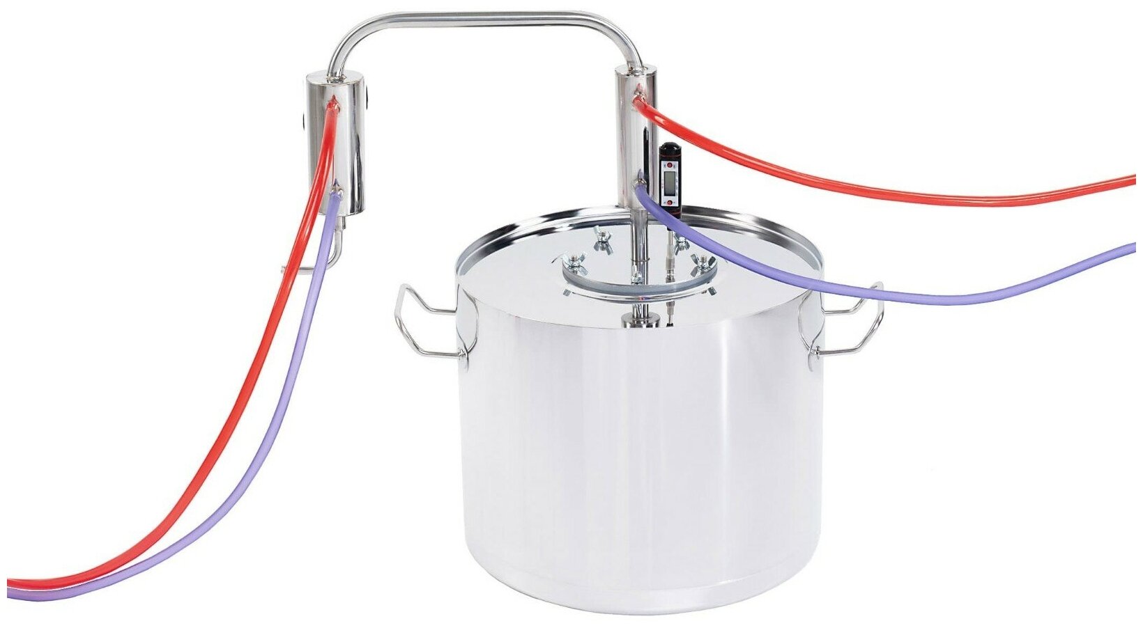 Самогонный аппарат, 5 барашков, прокладка из пищевого силикона, термометр электронный, 4 хомута, шланги синий и красный, спиртометр, сборник рецептов