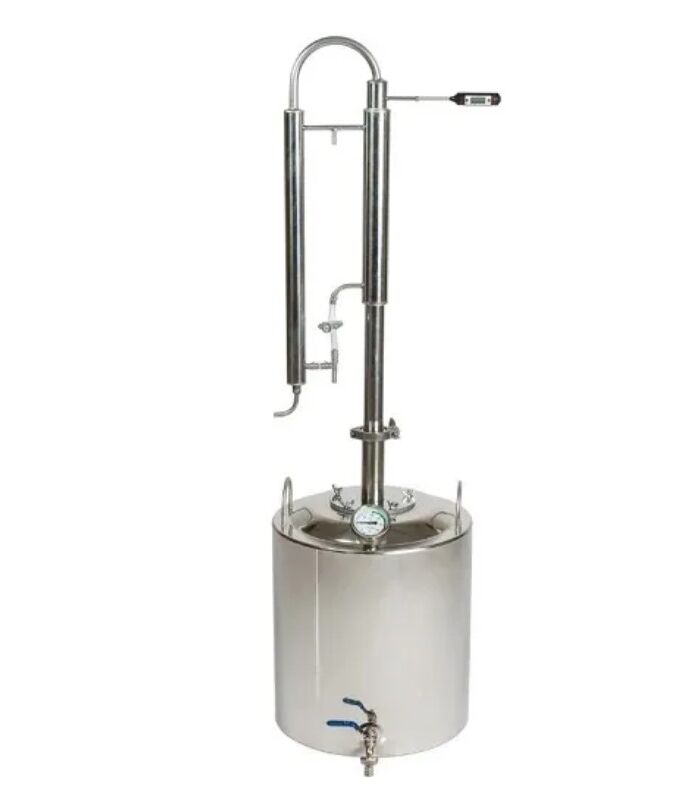 Самогонный аппарат Витязь - это пленочная колонна с двухконтурным охлаждением. Аппарат работает в 3 режимах: простая дистилляция (для производства 60-градусного самогона); перегонка с дефлегмацией (для получения спирта 70-80 об); ректификация (очистка и повышение крепости спирта/самогона до 80-90 об). Общая высота дистиллятора самогонного аппарата Витязь - 630 мм. Длина дефлегматора - 310 мм, а холодильника - 450 мм. В новой версии самогонного аппарата "Витязь" диаметр дефлегатора увеличен до 42 мм, холодильника - 32 мм. Подключая и отключая дополнительный контур охлаждения (на дефлегматоре), можно регулировать крепость алкоголя, а с дополнительными насадками РПН - даже получать чистый спирт.