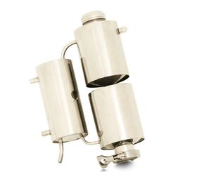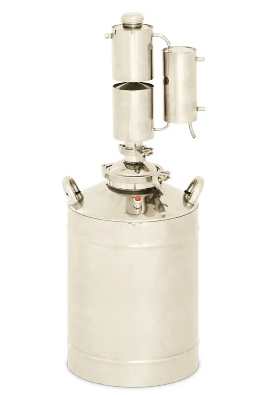Все оборудование смонтировано в виде одной колонны с боковым штуцером для шланга забора продукции. Диаметр царги увеличен, что исключает угрозу закупорки паропровода. Ректификационная колонна-дефлегматор работает как сухопарной фильтр, конденсируя тяжелые фракции по пути к холодильнику и отправляя их в отстойник. На выходе конденсируется очищенная фракция спирта-сырца без сивушных масел. Дистиллятор также оснащен дополнительным охладителем для готового самогона.Объём: 20 л
