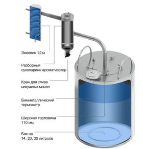 Аппарат Сельмаш — классический дистиллятор с сухопарником для качественной очистки перегоняемого продукта от сивушных масел. Сухопарник имеет разборную конструкцию и слив, что позволяет закладывать различные ингредиенты для ароматизации напитков в процессе перегонки. Аппарат имеет широкую горловину. Материал: пищевая нержавеющая сталь.