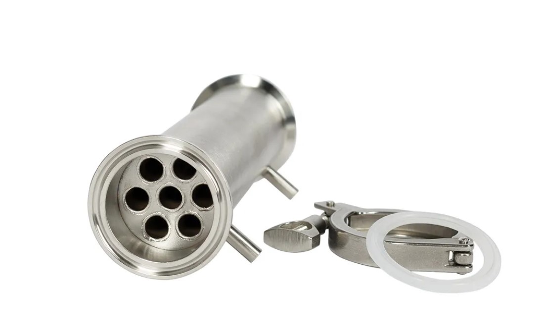 Представляет собой трубу в трубе. Длина рубашечного холодильника увеличена. Внутренняя трубка проходит через все устройство, поэтому продукт охлаждается качественно. К тому же холодильник отличается высокой пропускной способностью. Известно, что чем выше производительность холодильника, тем большую мощность нагрева вы сможете задать. Чем мощнее последняя, тем быстрее вы выгоните заданный объём браги. А при первом перегоне скорость очень важна.