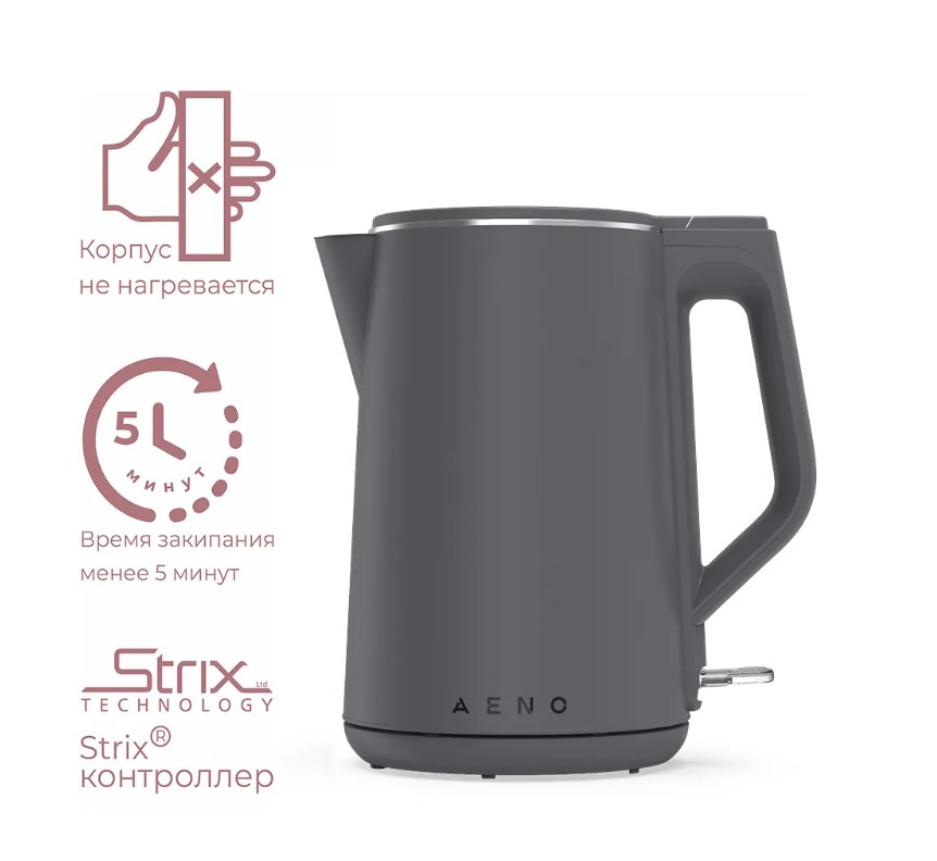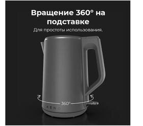 Электрочайник мощностью до 2200 Вт позволяет менее чем за 5 минут вскипятить 1,5 литра воды. Чайник легко поворачивается на 360, что позволяет избежать попадания пара на рядом стоящую мебель или бытовую технику. Световая индикация загорается при включении и автоматически гаснет при завершении работы чайника.