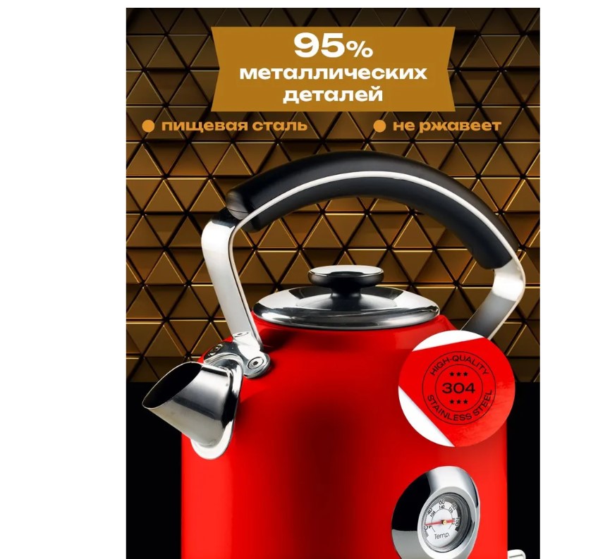 Конструкция чайника: Отсек для шнура, Фильтр от накипи, Вращение подставки на 360°