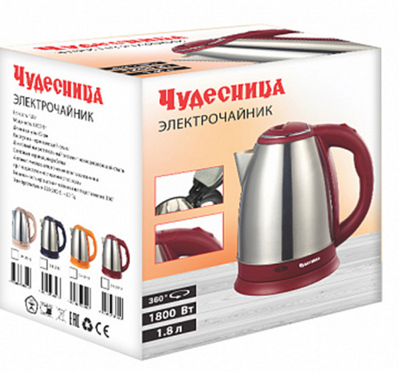 Чайник электрический Чудесница ЭЧ-2019 выполнен из высококачественной нержавеющей стали и высокопрочного пластика. Мощность чайника - 1800 Вт, а его объем составляет 1,8 л, рассчитан для чаепития большой семьи или компании. Ручка чайника эргономичной формы, сам чайник может поворачиваться на подставке на 360 градусов. В нижней части чайника имеется отсек для расположения сетевого шнура.