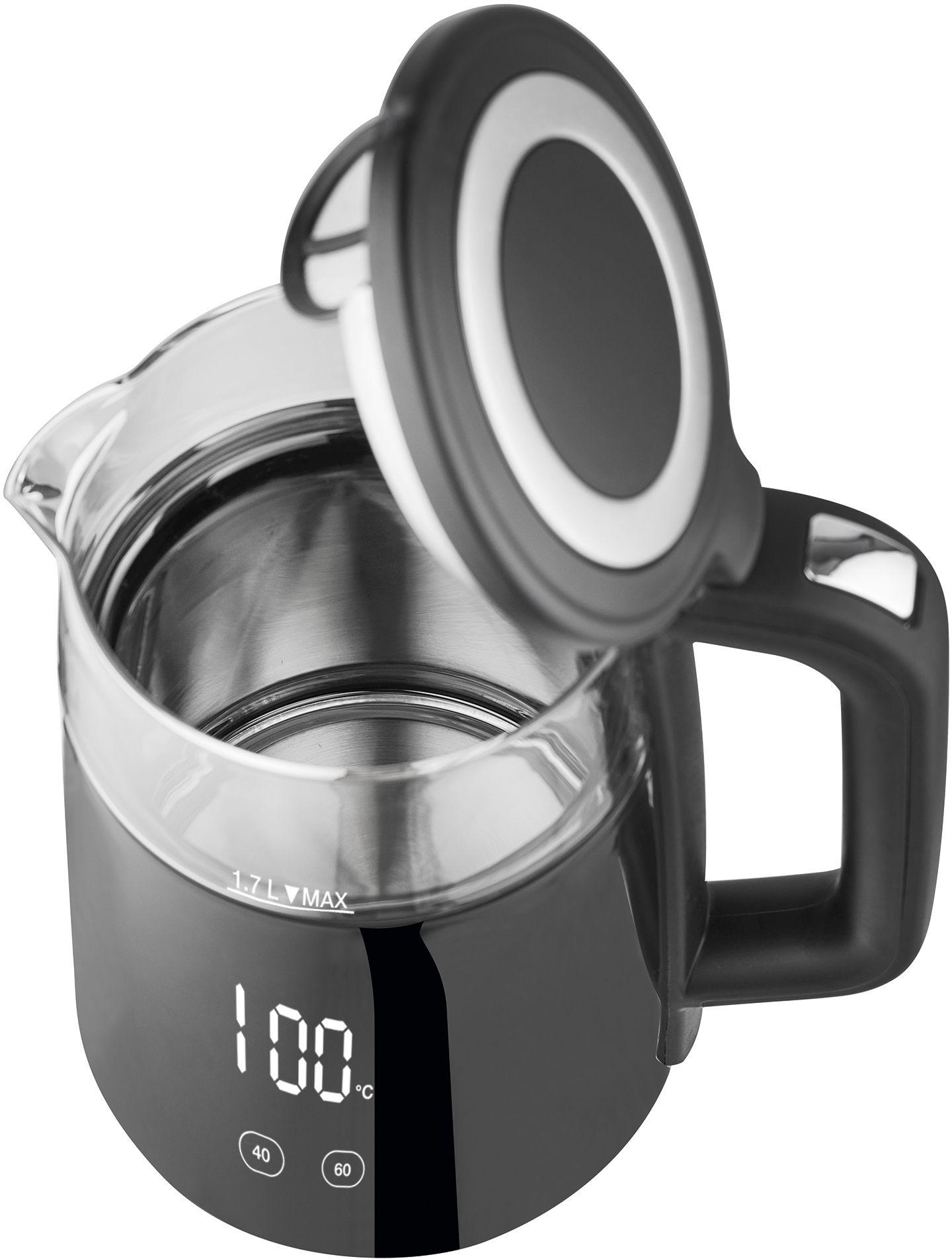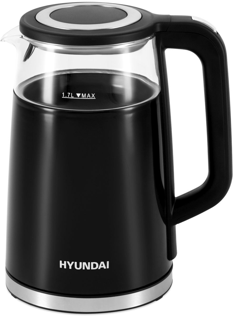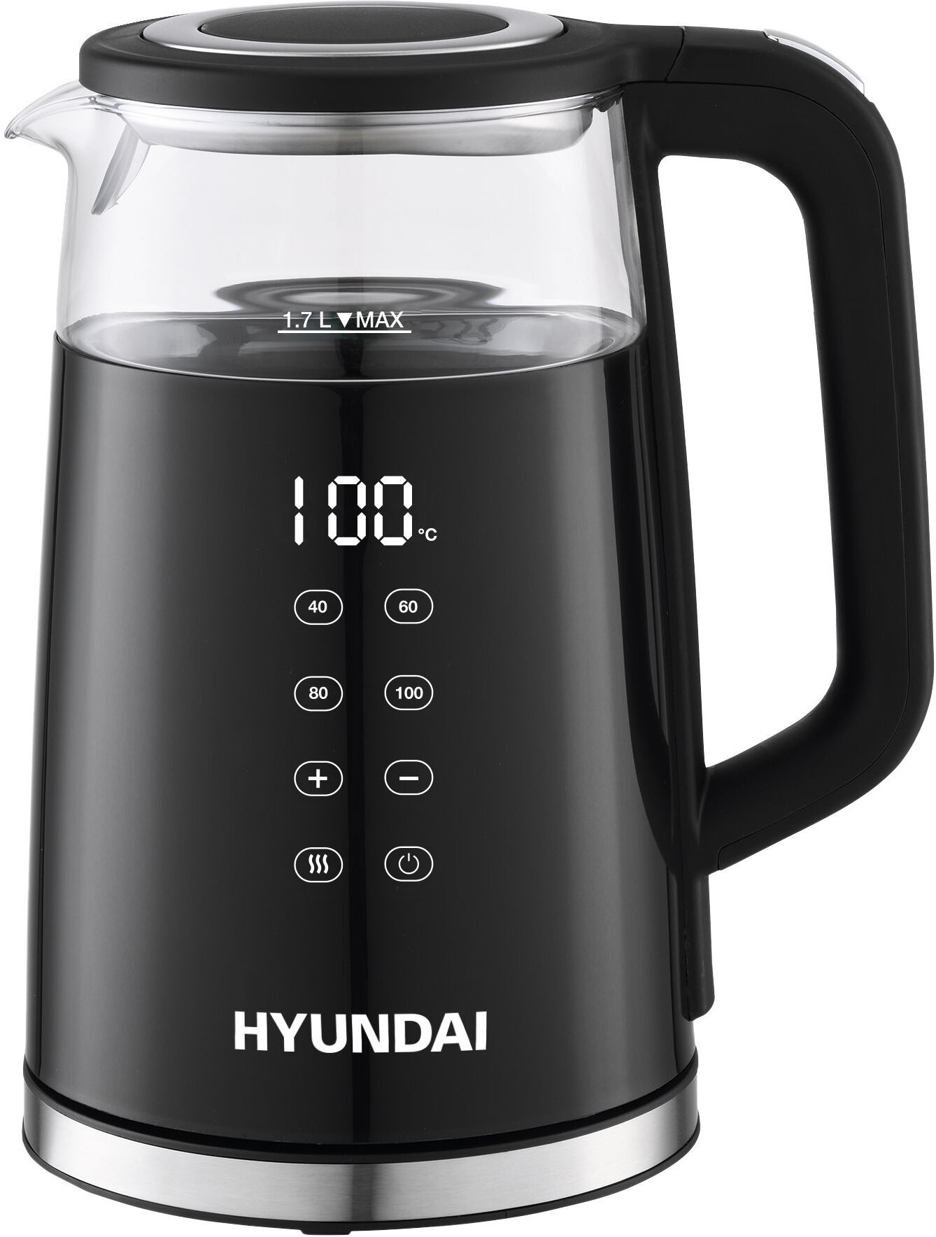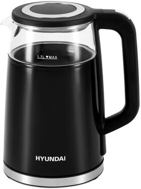 Hyundai HYK-G6404 – электрический чайник объемом 1,7 л с двойными стенками и сенсорной панелью управления с дисплеем. Модель обеспечивает возможность не только кипячения, но и подогрева воды до определенной температуры, а также её поддержания на установленном уровне до двух часов.