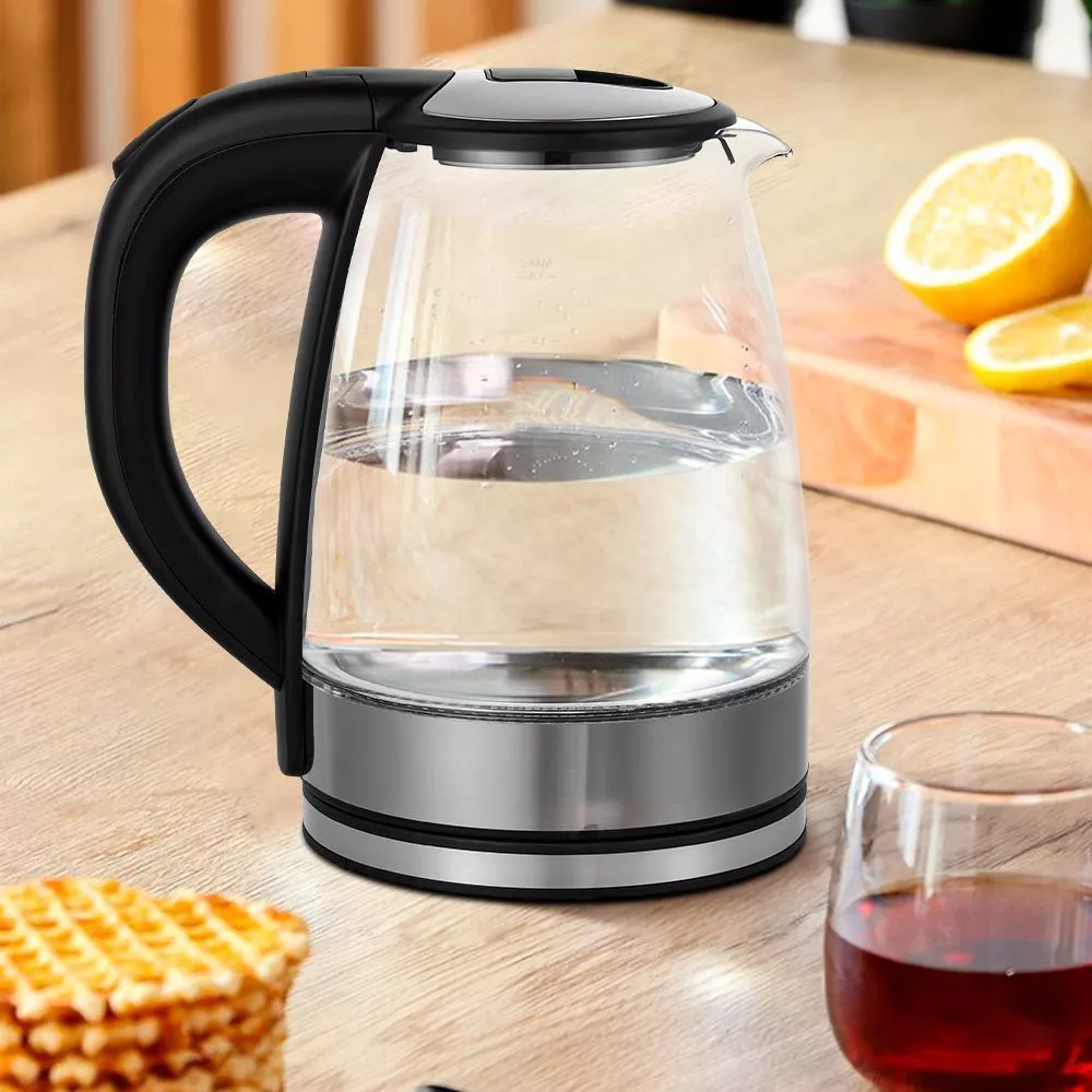 При включении чайника по периметру дна загорается синяя подсветка, которая является индикатором работы и одновременно художественно подсвечивает кипящую воду.