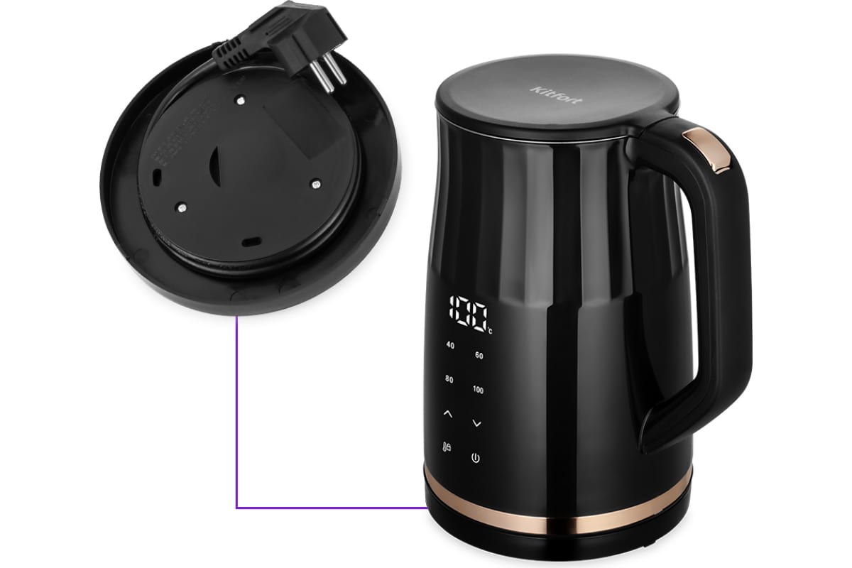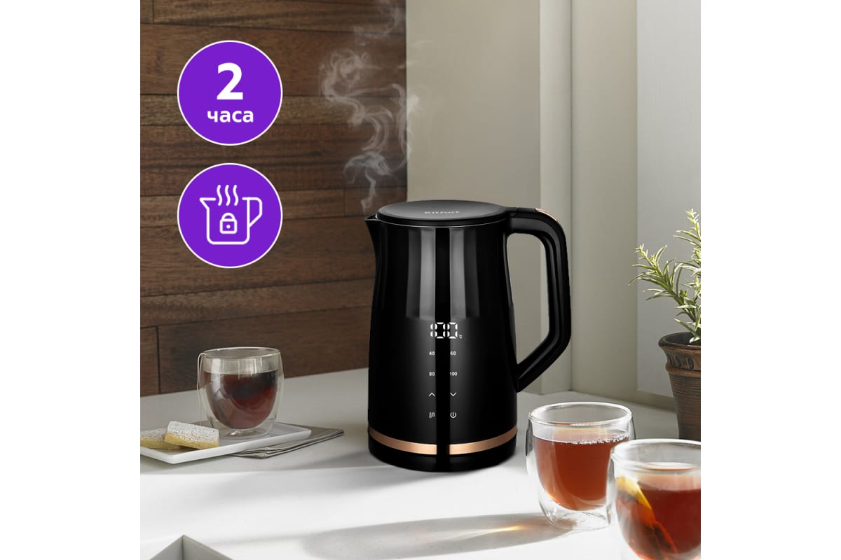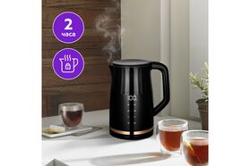 Электрический чайник КТ-6610 - отличное решение для ежедневного использования или особых моментов с родными и друзьями. Благодаря оригинальному дизайну он станет украшением вашей кухни. Раскрывайте вкус и аромат любимого чая! Вы можете выбрать 4 режима нагрева или самостоятельно настроить t °С от 40 до 95 °С с шагом 5 °С. Это крайне удобно для правильного заваривания разных сортов чая. Управление сенсорное, LED-дисплей показывает текущую t °С или заданную t °С нагрева. Сохраняет напиток горячим! Чайник оснащён функцией поддержания t °С в течение 2 ч на заданном уровне. Температура задаётся либо кнопками выбора: 40, 60, 80 или 100°С, либо с помощью кнопок “Больше” или “Меньше” на панели управления. Удобное добавление воды Горлышко большого диаметра и широко открывающаяся крышка позволяют легко наполнять водой, а также чистить чайник. Отметка максимального уровня воды располагается на внутренней поверхности прибора. Изнутри крышка и корпус выполнены из нержавеющей стали. Важные детали Чайник имеет широкий носик, который даёт хорошую струю воды без брызг. Ручка пластиковая, не нагревается и удобно лежит в руке. Безопасная работа Подставка с центральным контактом даёт возможность располагать на ней чайник в любом положении, обеспечивая вращение на 360°. При закипании чайник автоматически отключается. Прибор имеет защиту от перегрева и от включения без воды. Компактное хранение На дне подставки имеется отсек для хранения шнура, чтобы его излишки не мешались на столе.