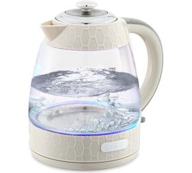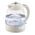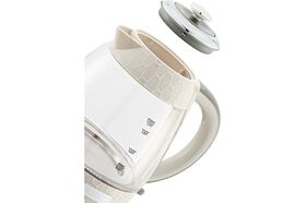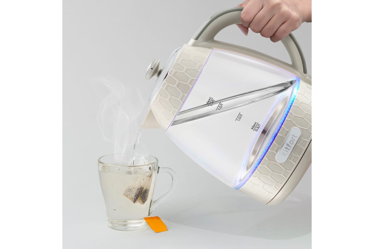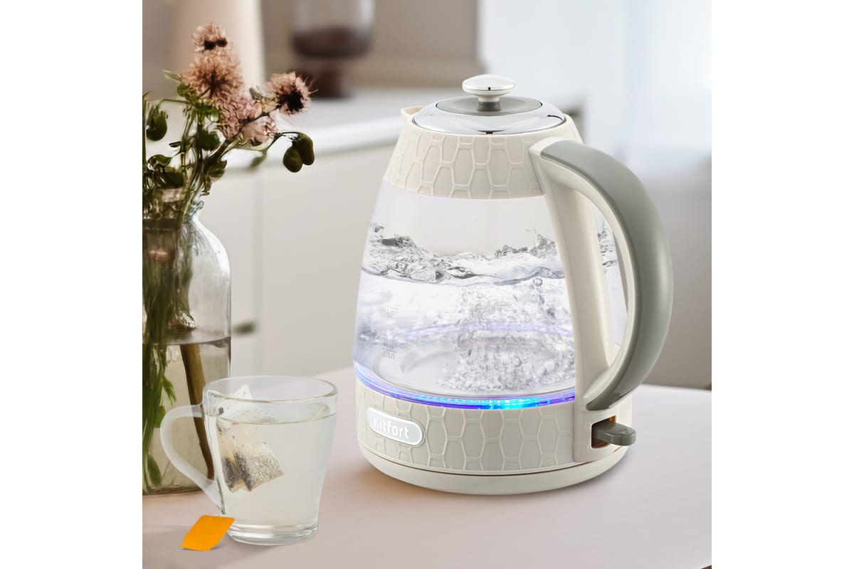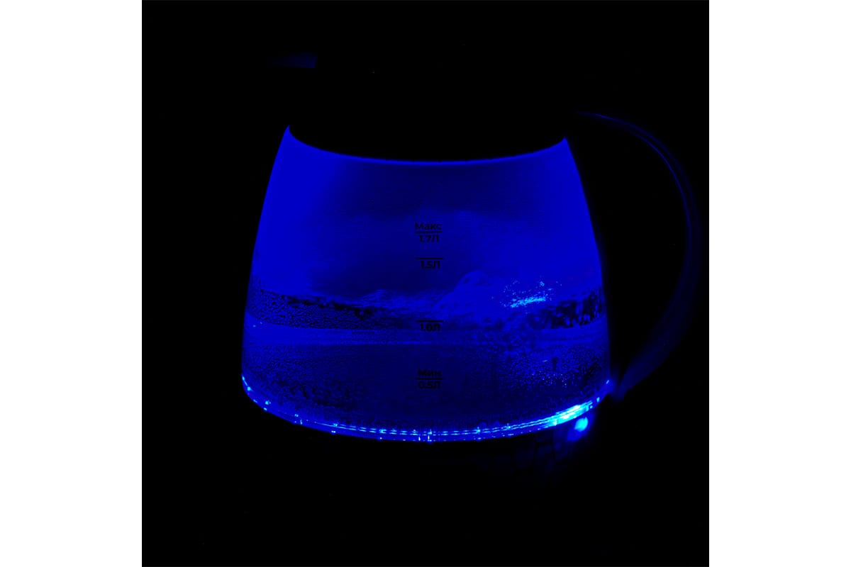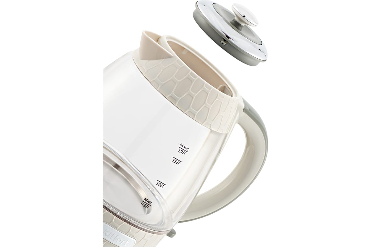 Корпус чайника выполнен из сочетания стекла, нержавеющей стали и пластика. Ручка выполнена из пластика, а крышка — из сочетания нержавеющей стали и пластика. Мерная шкала находится на внешней стороне корпуса. Ручка чайника пластиковая, не нагревается и удобно лежит в руке. При включении чайника загорается подсветка, которая является индикатором работы и одновременно подсвечивает воду в приборе. Нагревательный элемент (ТЭН) у этой модели чайника скрытый и находится в донной части. Сверху он закрыт специальной металлической пластиной из нержавеющей стали, благодаря которой исключается прямой контакт ТЭНа с водой. Такая конструкция препятствует образованию накипи, облегчает уход и значительно снижает шум при нагревании воды. Подставка с центральным контактом дает возможность располагать на ней чайник в любом положении, обеспечивая вращение на 360°. Чайник автоматически отключается при закипании, имеет защиту от перегрева и от включения без воды. При закипании воды образующийся пар попадает в паропровод, проходит по нему и затем воздействует на термодатчик, который отключает чайник. Такая конструкция позволяет чайнику отключаться при закипании воды независимо от альтитуды (высоты над уровнем моря).
