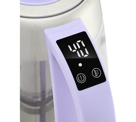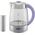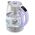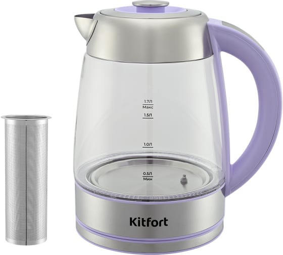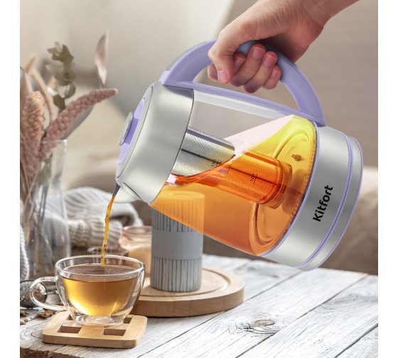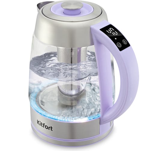 Корпус чайника выполнен из сочетания стекла, нержавеющей стали и пластика. Мерная шкала находится на внешней стороне корпуса. На ручке чайника расположена панель управления и LED-дисплей. На дисплее отображается текущая температура воды в чайнике, а при установке температуры — температура нагрева воды. Температура воды на дисплее отображается постоянно, что очень удобно. При включении чайника загорается подсветка, которая является индикатором работы и одновременно художественно подсвечивает воду в приборе. Цвет подсветки меняется в зависимости от температуры воды во время нагрева. В чайнике КТ-6624 есть заварочный фильтр. Вам нужно только засыпать чайные листья в фильтр, залить воду и выбрать температуру нагрева для данного сорта чая. Нагревательный элемент (ТЭН) у этой модели чайника скрытый и находится в донной части. Сверху он закрыт специальной металлической пластиной из нержавеющей стали, благодаря которой исключается прямой контакт ТЭНа с водой. Такая конструкция препятствует образованию накипи, облегчает уход и значительно снижает шум при нагревании воды. Подставка с центральным контактом дает возможность располагать на ней чайник в любом положении, обеспечивая вращение на 360°. Снизу подставки расположен отсек для хранения шнура, чтобы шнур не мешал на столе. Полный чайник закипает примерно за 5 минут. При закипании воды образующийся пар попадает в паропровод, проходит по нему и затем воздействует на термодатчик, который отключает чайник.