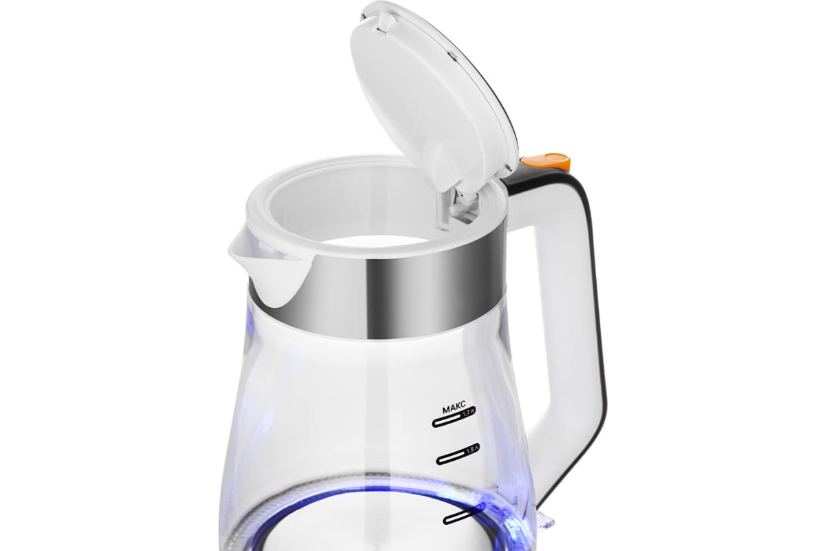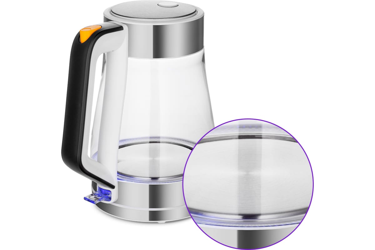 Корпус чайника выполнен из нержавеющей стали и стекла. Крышка и подставка выполнены из нержавеющей стали и пластмассы. Отметки «МАКС» и «МИН» нанесены на стеклянную часть чайника. Ручка чайника пластиковая, не нагревается и удобно лежит в руке. Внутренняя поверхность чайника полностью состоит из металла и стекла, благодаря чему вода не соприкасается с пластиком. При включении чайника загорается подсветка, которая является индикатором работы.