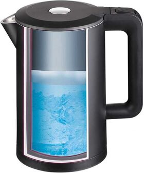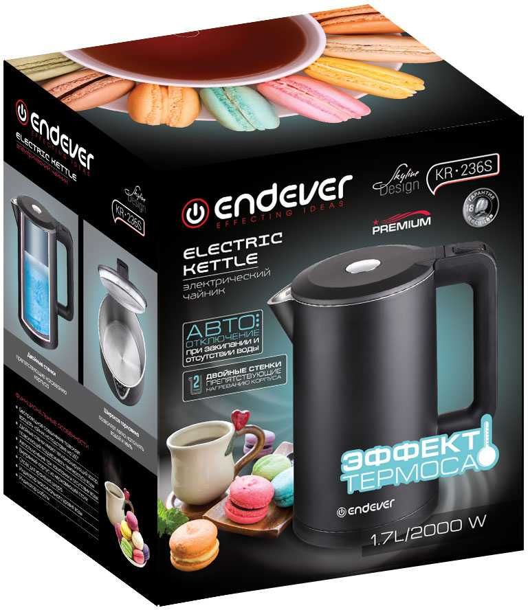 Описание Чайник электрический Skyline KR-236S, 1,7л, черный, 2000Вт, эффект термоса, двойные ненагревающиеся стенки, корпус -матовый пластик, внутренняя емкость из нержавеющей стали, индикатор работы на ручке, длина шнура 0,75 м, автоотключение при отсутствиии воды, широкая горловина, вес 1,15 кг