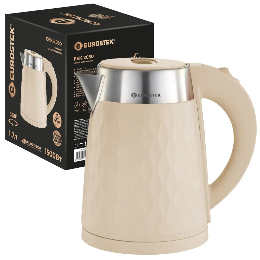 Чайник EUROSTEK EEK-2050 быстро вскипятит воду объемом до 1,7 л благодаря мощности 1500 Вт. Он автоматически отключается после закипания жидкости. Чайник установлен на подставке с возможностью поворота на 360°, а скрытый нагревательный элемент, удобная крышка и носик для наливания обеспечат комфортное ежедневное использование. Модель оснащена многоуровневой защитой: автоматическим отключением при закипании и отключением при недостаточном количестве воды.