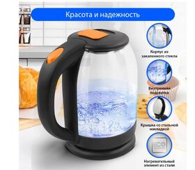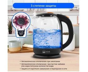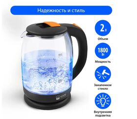 Легкий и прочный стеклянный чайник с голубой внутренней подсветкой в стильном прозрачном корпусе из закаленного стекла. Качественное стекло сохраняет природный вкус и все натуральные свойства воды, не выделяя примесей. Двухлитровый чайник имеет повышенную мощность 1.8 кВт для самого быстрого закипания воды и закрытый нагревательный элемент для противостояния накипи и легкости ухода. Вращение чайника на базе обеспечивает простой доступ к его ручке с любой стороны без опасности обжечься, а многоуровневая система защиты автоматически отключит чайник при готовности кипятка или при недостаточном количестве воды. Светодиодная подсветка дарит прекрасное настроение игрой света в пузырьках закипающей воды.