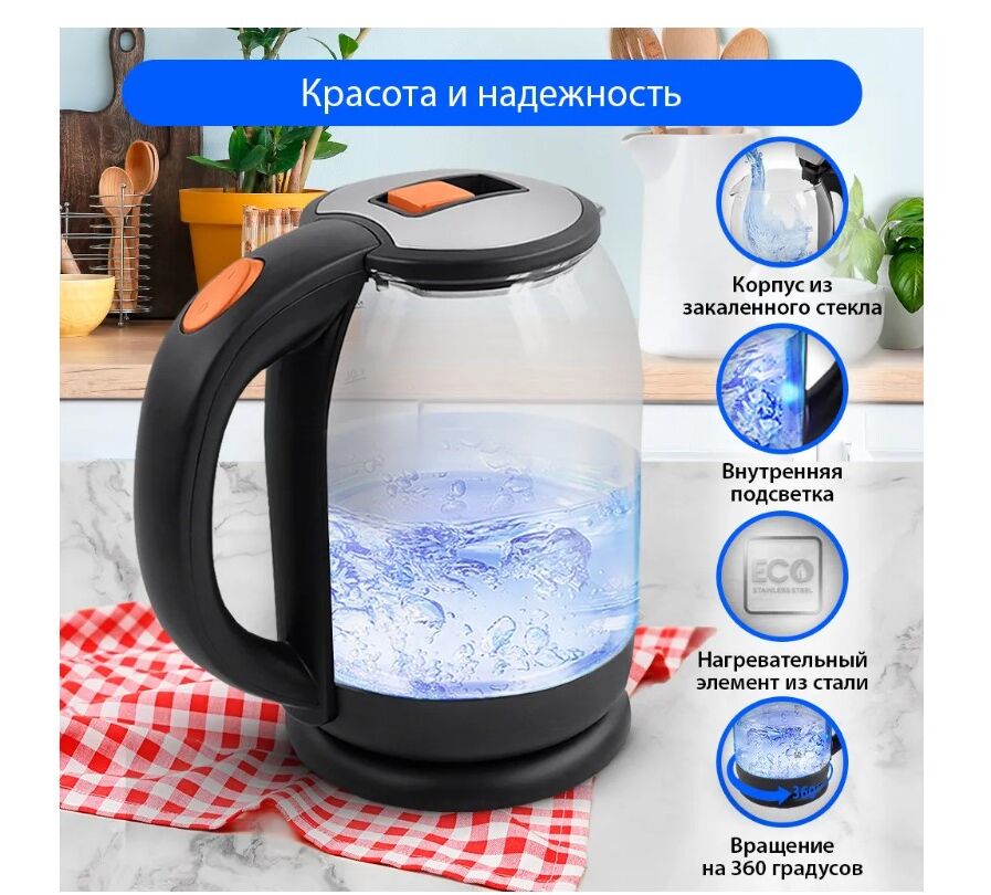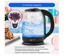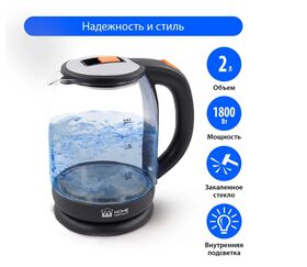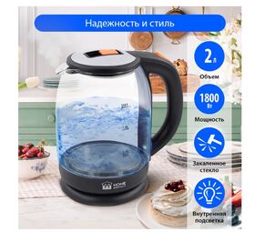 Легкий и прочный стеклянный чайник с голубой внутренней подсветкой в стильном прозрачном корпусе из закаленного стекла. Качественное стекло сохраняет природный вкус и все натуральные свойства воды, не выделяя примесей. Двухлитровый чайник имеет повышенную мощность 1.8 кВт для самого быстрого закипания воды и закрытый нагревательный элемент для противостояния накипи и легкости ухода. Вращение чайника на базе обеспечивает простой доступ к его ручке с любой стороны без опасности обжечься, а многоуровневая система защиты автоматически отключит чайник при готовности кипятка или при недостаточном количестве воды. Светодиодная подсветка дарит прекрасное настроение игрой света в пузырьках закипающей воды.