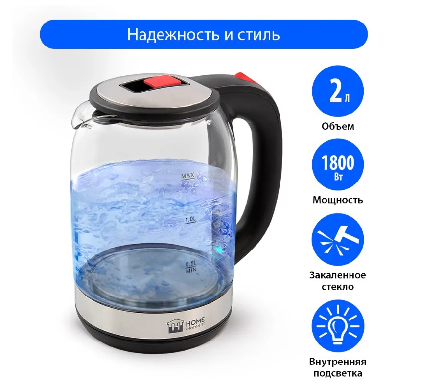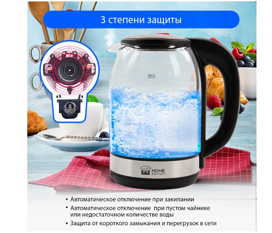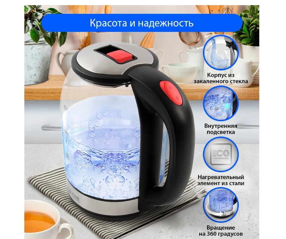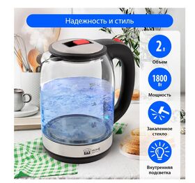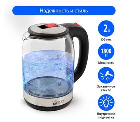 Легкий и прочный стеклянный чайник с голубой внутренней подсветкой в стильном прозрачном корпусе из закаленного стекла. Качественное стекло сохраняет природный вкус и все натуральные свойства воды, не выделяя примесей. Двухлитровый чайник имеет повышенную мощность 1.8 кВт для самого быстрого закипания воды и закрытый нагревательный элемент для противостояния накипи и легкости ухода. Вращение чайника на базе обеспечивает простой доступ к его ручке с любой стороны без опасности обжечься, а многоуровневая система защиты автоматически отключит чайник при готовности кипятка или при недостаточном количестве воды. Светодиодная подсветка дарит прекрасное настроение игрой света в пузырьках закипающей воды.