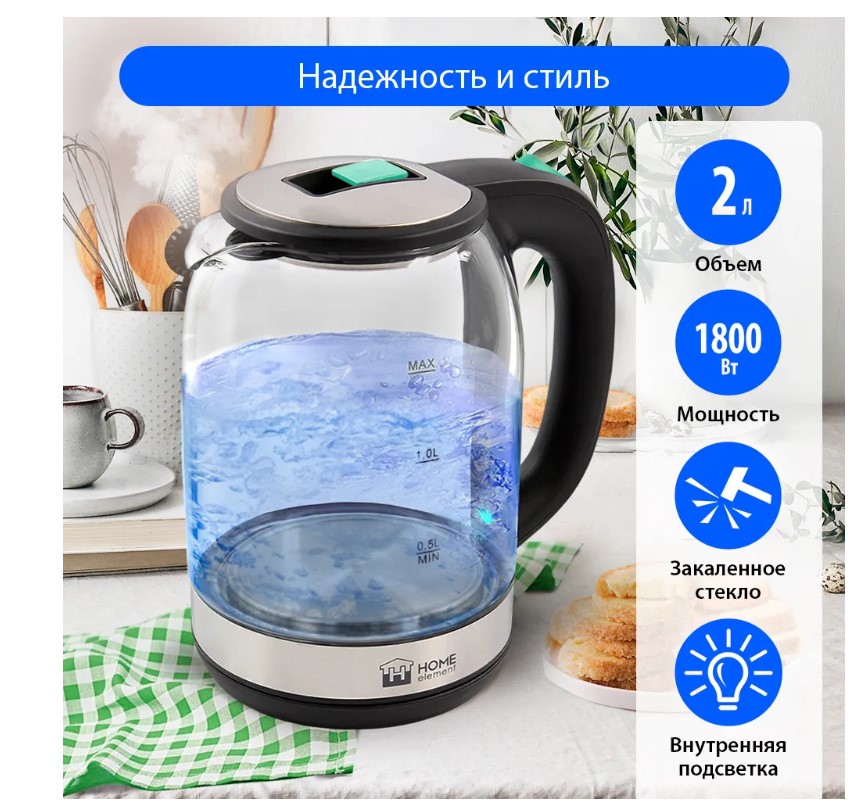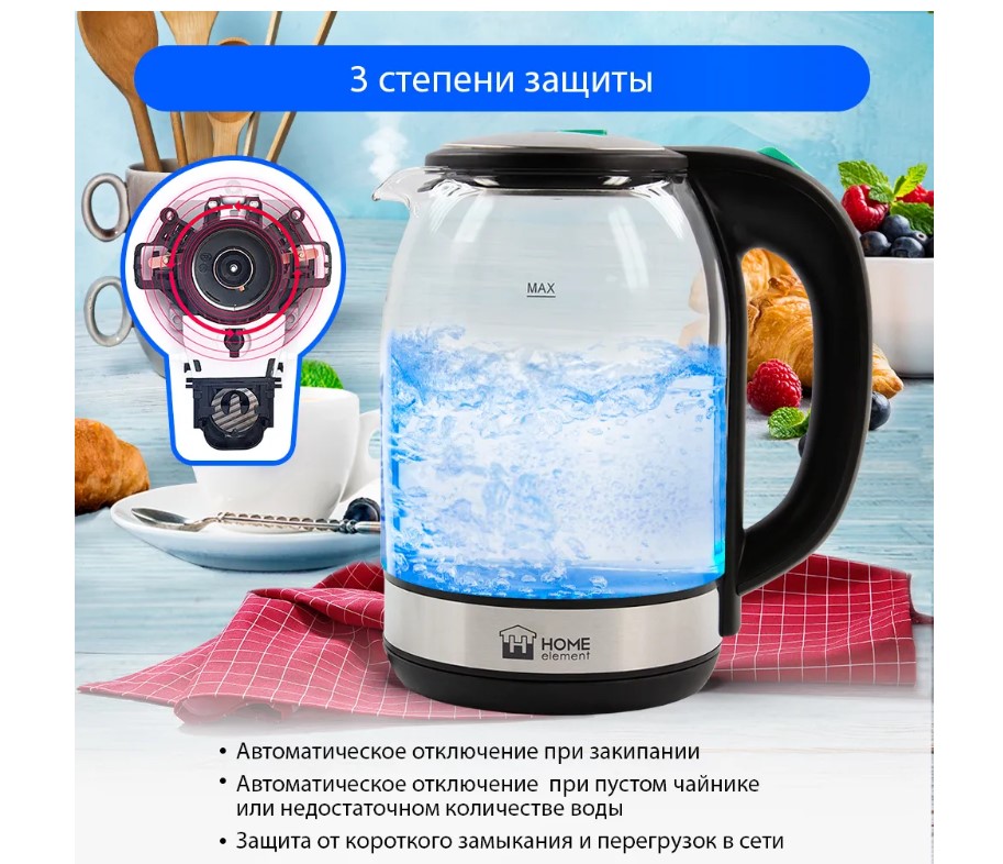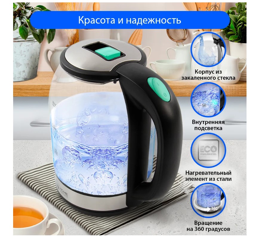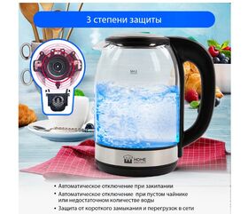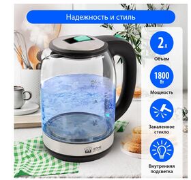 Легкий и прочный стеклянный чайник с голубой внутренней подсветкой в стильном прозрачном корпусе из закаленного стекла. Качественное стекло сохраняет природный вкус и все натуральные свойства воды, не выделяя примесей. Двухлитровый чайник имеет повышенную мощность 1.8 кВт для самого быстрого закипания воды и закрытый нагревательный элемент для противостояния накипи и легкости ухода. Вращение чайника на базе обеспечивает простой доступ к его ручке с любой стороны без опасности обжечься, а многоуровневая система защиты автоматически отключит чайник при готовности кипятка или при недостаточном количестве воды. Светодиодная подсветка дарит прекрасное настроение игрой света в пузырьках закипающей воды.