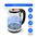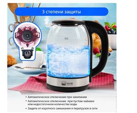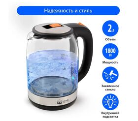 Легкий и прочный стеклянный чайник с голубой внутренней подсветкой в стильном прозрачном корпусе из закаленного стекла. Качественное стекло сохраняет природный вкус и все натуральные свойства воды, не выделяя примесей. Двухлитровый чайник имеет повышенную мощность 1.8 кВт для самого быстрого закипания воды и закрытый нагревательный элемент для противостояния накипи и легкости ухода. Вращение чайника на базе обеспечивает простой доступ к его ручке с любой стороны без опасности обжечься, а многоуровневая система защиты автоматически отключит чайник при готовности кипятка или при недостаточном количестве воды. Светодиодная подсветка дарит прекрасное настроение игрой света в пузырьках закипающей воды.