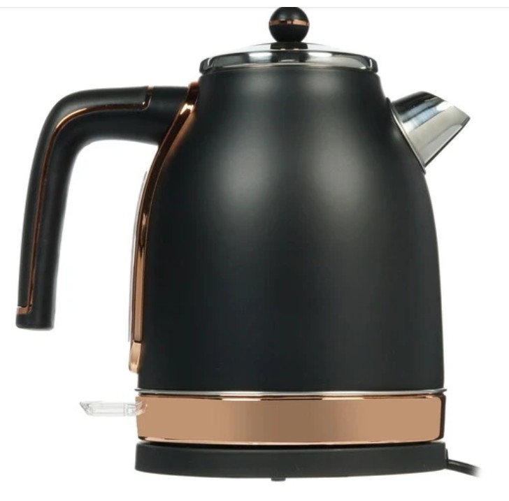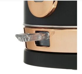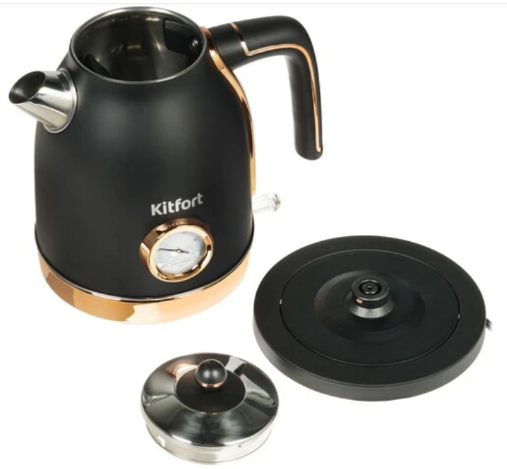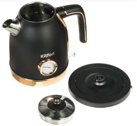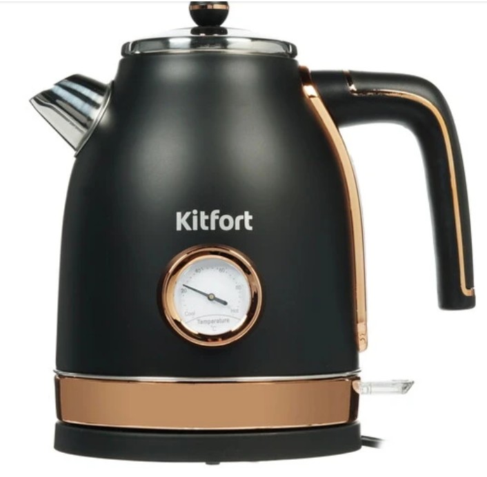 Электрочайник Kitfort KT-6102-2 – великолепный выбор для любителей винтажного стиля. В дизайне модели использовано эффектное сочетание черного и золотистого цветов. Установлен выполненный в ретро-стиле термометр, показания которого нужны для контроля текущей температуры воды. Данная возможность может быть полезна в ходе приготовления разных напитков. Воду можно будет не кипятить повторно, а лишь нагреть до определенной температуры.