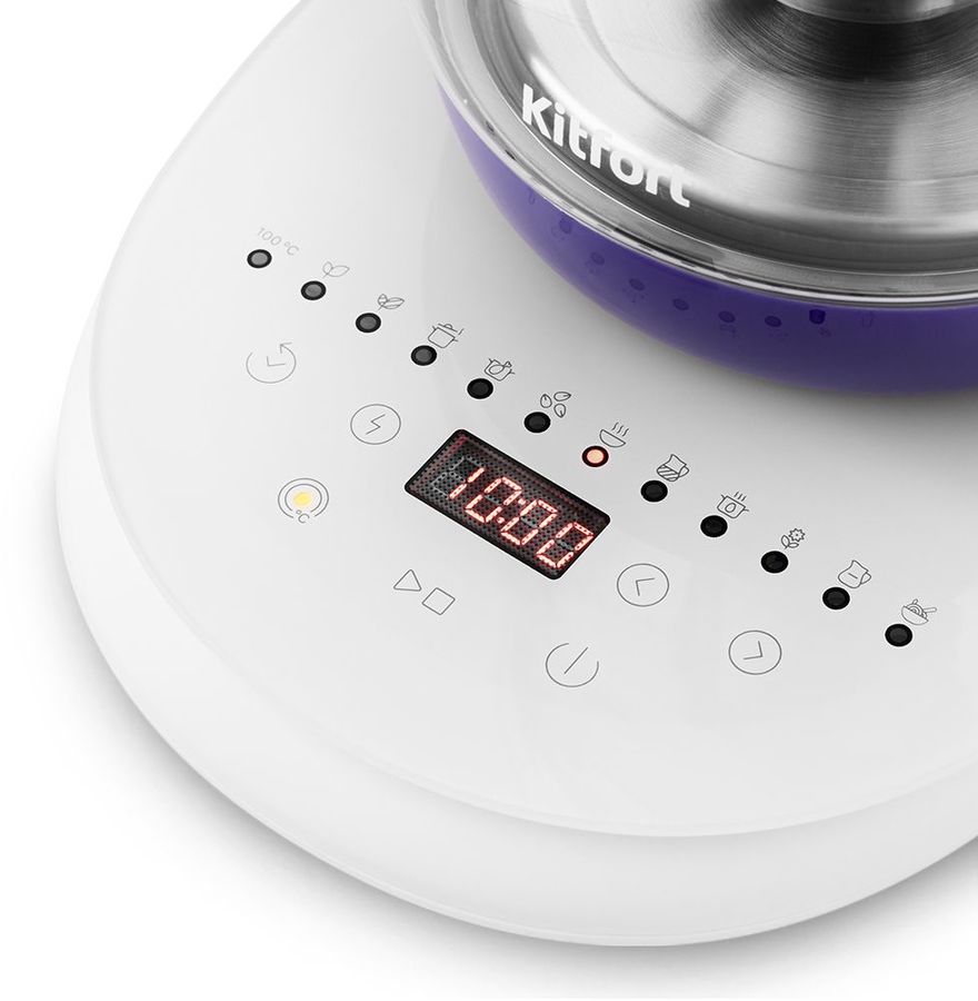 Электрический чайник с сенсорным управлением КТ-6130 является универсальным прибором для приготовления не только напитков, но и пищи. Помимо кипячения, прибор греет воду до заданной t, а также имеет специальные программы для приготовления различных блюд. На ярком дисплее отображается t воды и время.