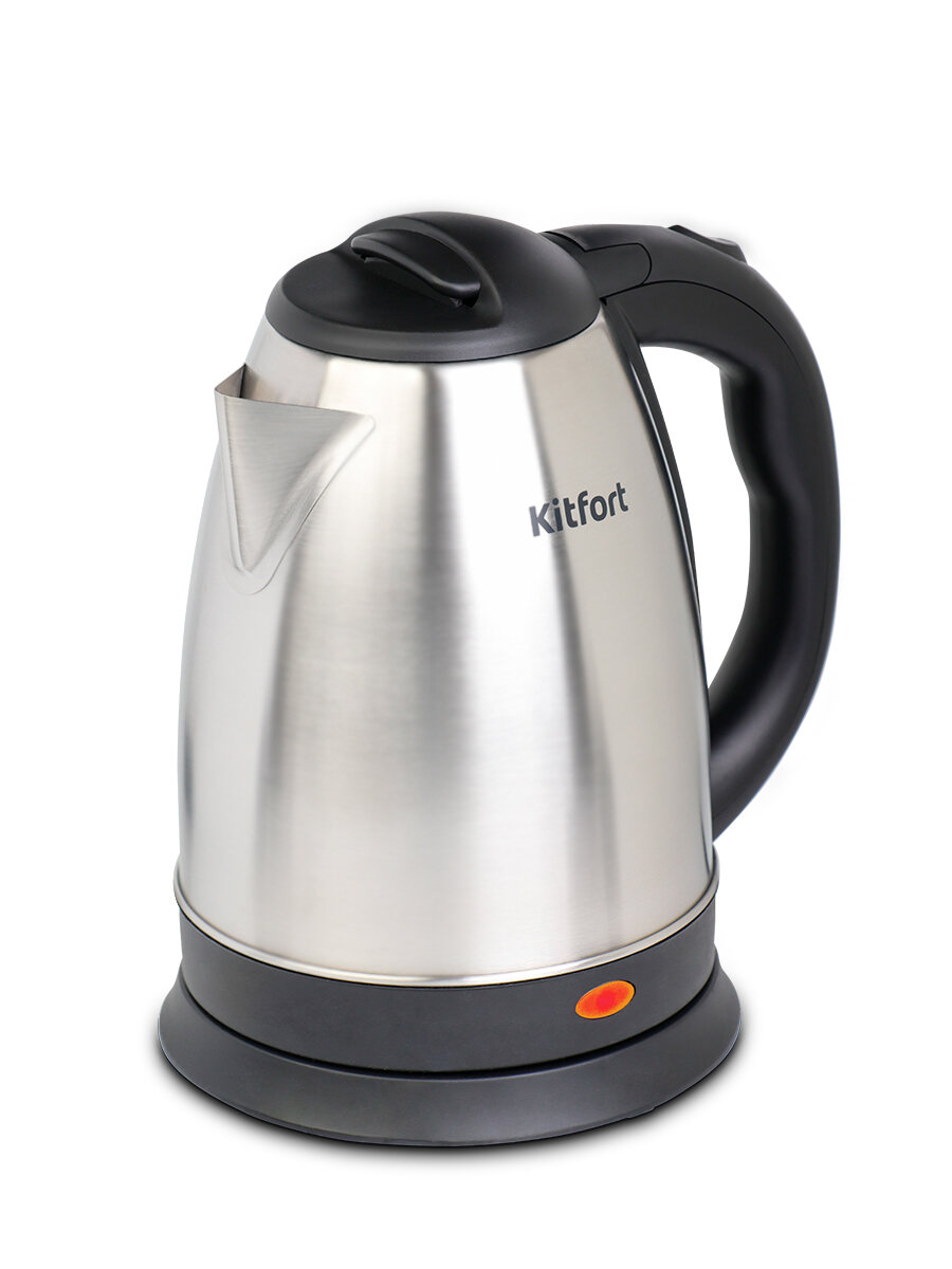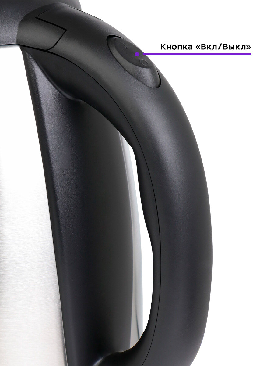 Кнопка «Вкл/Выкл» находится на ручке. При включении чайника загорается подсветка индикатора работы. Ручка чайника пластиковая, не нагревается и удобно лежит в руке. Полный чайник закипает за 7 минут.