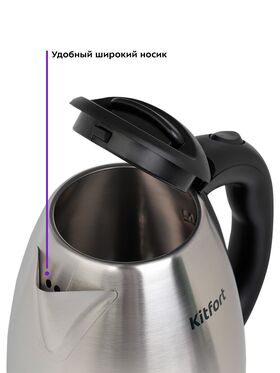 Крышка чайника выполнена из пластмассы с вставкой из нержавеющей стали. Мерная шкала находится внутри корпуса. Чайник имеет большое горлышко, что облегчает доступ внутрь при мытье.