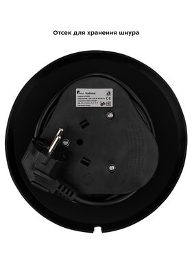 Подставка с центральным контактом дает возможность располагать на ней чайник в любом положении, обеспечивая вращение на 360°. Снизу имеется отсек для хранения шнура, в который можно смотать излишки шнура электропитания, чтобы он не мешал на столе.