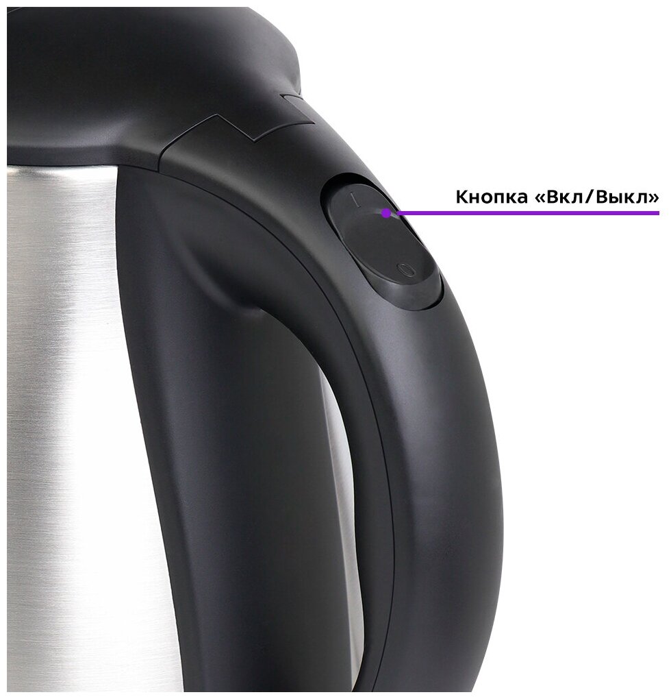 Кнопка «Вкл/Выкл» находится на ручке. При включении чайника загорается подсветка индикатора работы. Ручка чайника пластиковая, не нагревается и удобно лежит в руке. Полный чайник закипает за 6 минут.