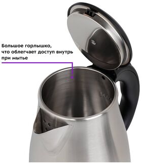 Крышка чайника выполнена из пластмассы с вставкой из нержавеющей стали. Мерная шкала находится внутри корпуса. Чайник имеет большое горлышко, что облегчает доступ внутрь при мытье.