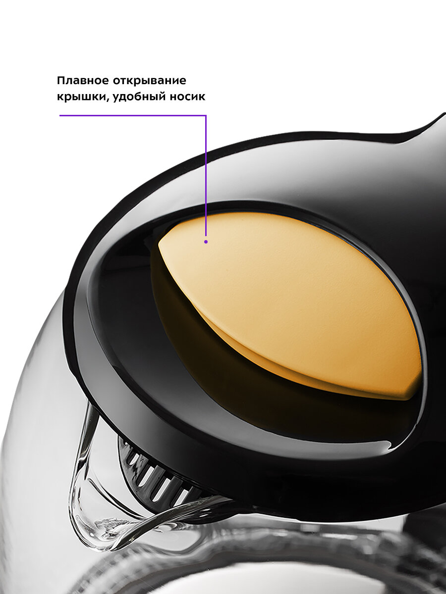 Чайник имеет большое горлышко, что облегчает доступ внутрь при мытье, а также съёмный фильтр-сетку для защиты от накипи.