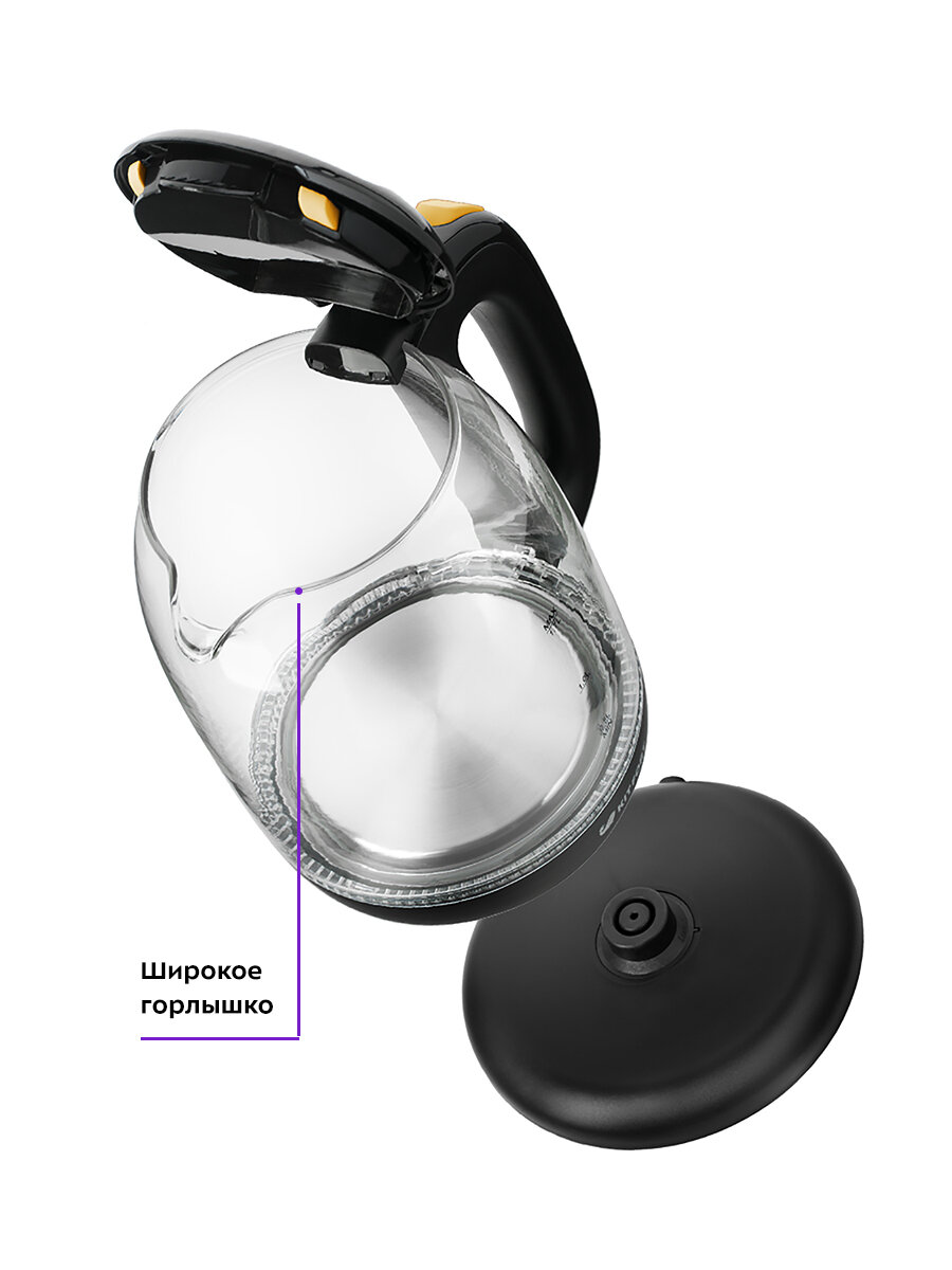 Корпус чайника выполнен из стекла, а крышка и подставка — из пластмассы. Мерная шкала нанесена на прозрачную часть корпуса. Подставка с центральным контактом дает возможность располагать на ней чай ник в любом положении, обеспечивая вращение на 360°.