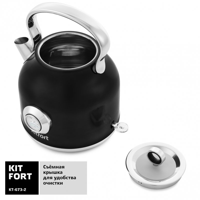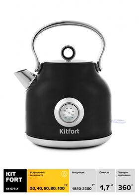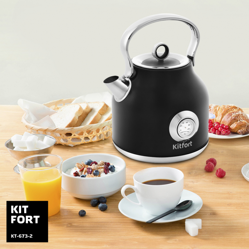 Электрический чайник Kitfort КТ-673-2 предназначен для кипячения воды дома, в офисах и загородных домах. Главная особенность модели – наличие термометра на боковой поверхности корпуса, благодаря которому можно точно оценить температуру воды для приготовления того или иного напитка. Ручка чайника изготовлена из пластика, а корпус – из нержавеющей стали. Ручка не нагревается и удобно лежит в руке. Кнопка включения/выключения расположена на корпусе снизу, на противоположной стороне от носика чайника. Чайник укомплектован крышкой с удобной ручкой. Подставка выполнена из пластика. Нагревательный элемент (ТЭН) у данной модели чайника скрытый и находится в донной части. Сверху он закрыт специальной металлической пластиной из нержавеющей стали, благодаря которой исключается прямой контакт ТЭНа с водой и обеспечивается повышенный срок его службы. Такая конструкция также препятствует образованию накипи, облегчает уход и значительно снижает шум при нагревании воды. Подставка с центральным контактом дает возможность располагать на ней чайник в любом положении, обеспечивая вращение на 360°. Есть отсек для хранения шнура. Чайник автоматически отключается при закипании и при снятии с подставки, имеет защиту от перегрева и от включения без воды.