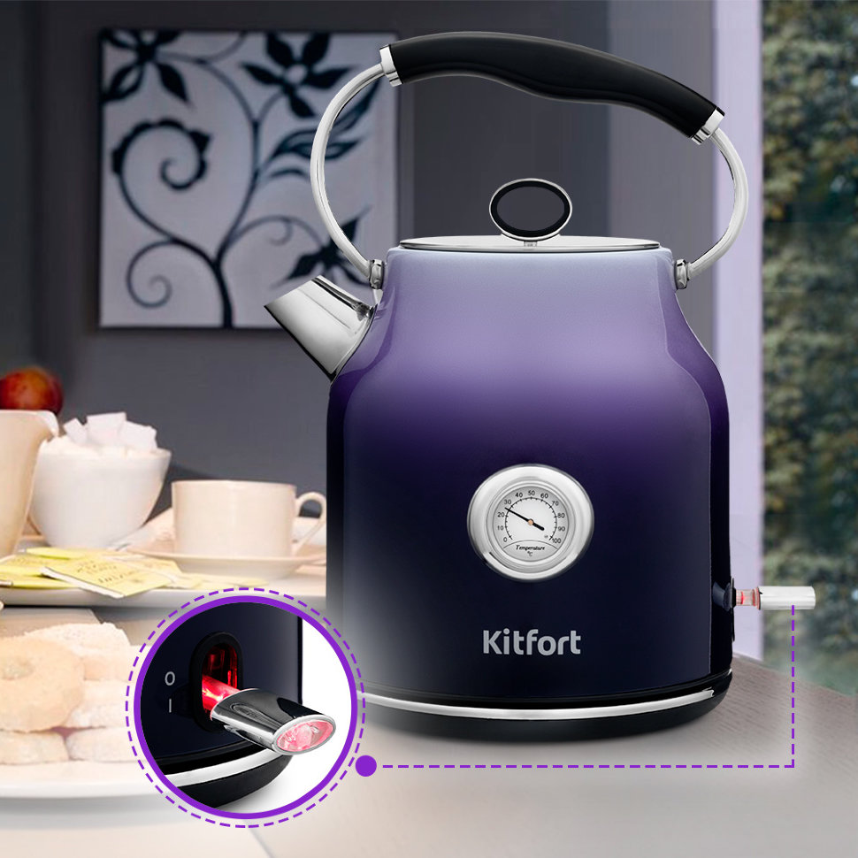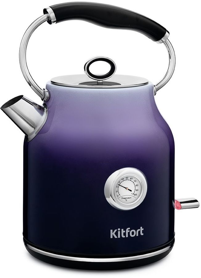 Особенности Чайник Kitfort КТ-679 имеет встроенный термометр, выполненный в винтажном стиле. Это очень удобно для заваривания различных напитков, для которых требуется определённая температура воды. Например, зелёный чай, белый чай, кофе и тд.
