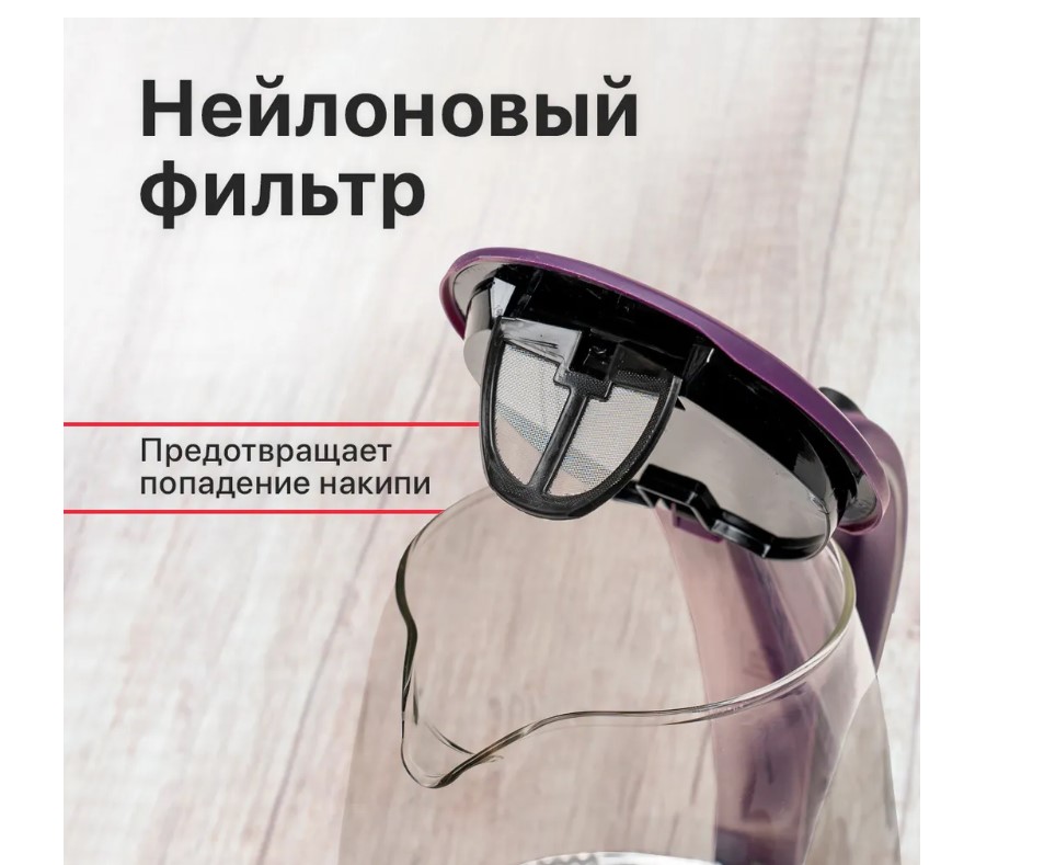 В носике чайника расположен фильтр для защиты от попадания накипи в напиток. Все пластиковые элементы в электрических чайниках KRAFT выполнены из пищевого пластика первичной обработки, соответствующих стандартам директивы Европейского союза RoHS. Это значит что в пластике нет вредных примесей и этот пластик может в открытом виде контактировать с водой и пищевыми продуктами, не боится нагрева до температуры кипения воды.
