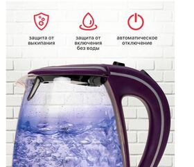 Чайник с приятной синей светодиодной подсветкой станет украшением для вашей кухни. Получайте удовольствие от любимых напитков в атмосфере уюта!Корпус данной модели выполнен из закаленного стекла, которое отличается повышенной прочностью. Прозрачное стекло с отметками объема с двух сторон позволяет вскипятить ровно столько воды, сколько нужно, не расходуя излишнюю электроэнергию и сохраняя окружающую среду.