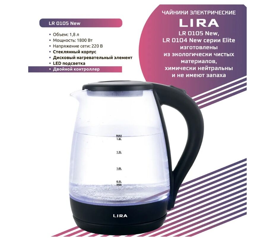 Домашний электрический стеклянный чайник LIRA изготовлен из экологически чистых материалов, химически нейтральны и не имеют запаха. Вращающийся корпус на 360 градусов. У модели чайника электрического стеклянный корпус и светло-голубая LED-подсветка, которая служит индикатором кипения, визуально украшает прибор и делает кухню ещё уютнее.