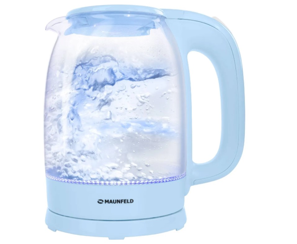 При включении загорается синяя подсветка, которая красиво подсвечивает кипящую воду и является индикатором включения чайника.