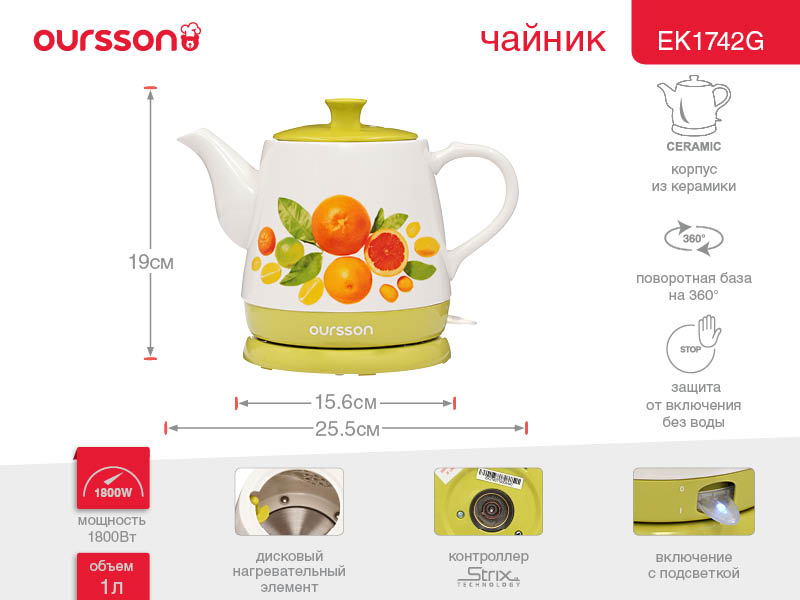 Керамический чайник EK1742G выполнен в ярком стиле с оригинальным дизайном корпуса. Чайник изготовлен из экологически чистого материала - керамики, которая не выделяет вредных веществ, не изменяет вкус и запах воды, а также в течение долгого времени сохраняет и поддерживает тепло, что обеспечивает экономию электроэнергии.