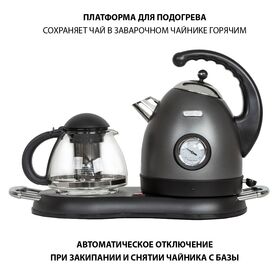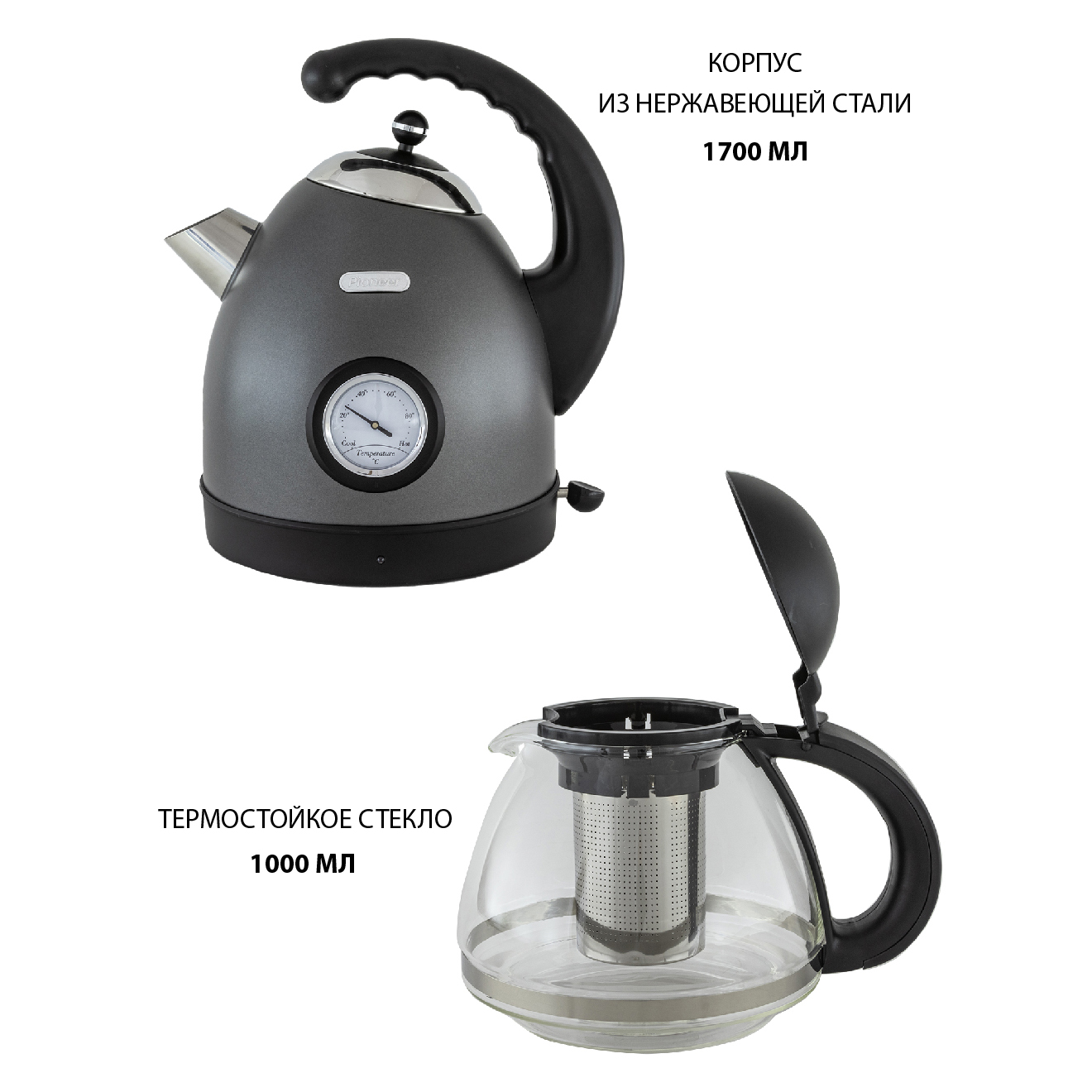 Комплектация: чайник, стеклянный заварочный чайник, гарантийный талон, инструкция на русском языке