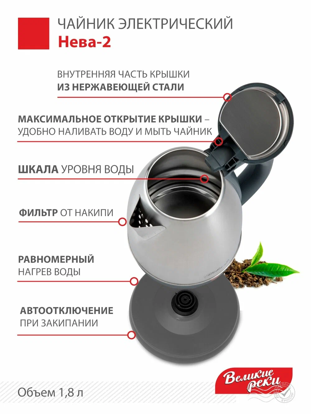 вращение на 360 градусов, индикатор уровня воды, индикация включения, отсек для хранения шнура, фильтр