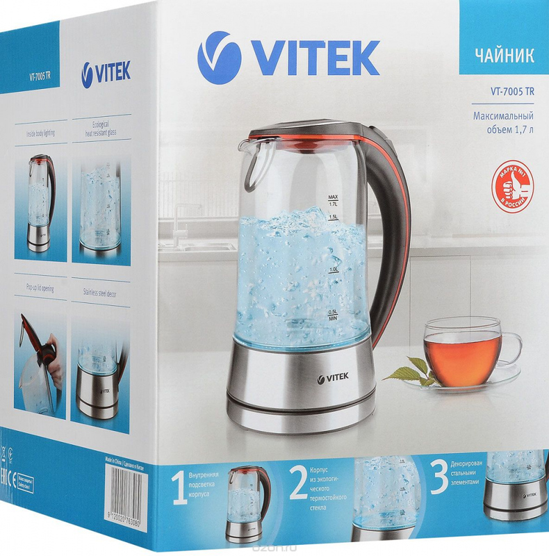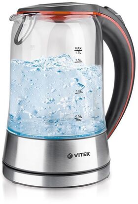 мощность 2200Вт; объем 1.7л; корпус стекло и нержавеющая сталь; фильтр от накипи, подсветка воды; цвет серебристый