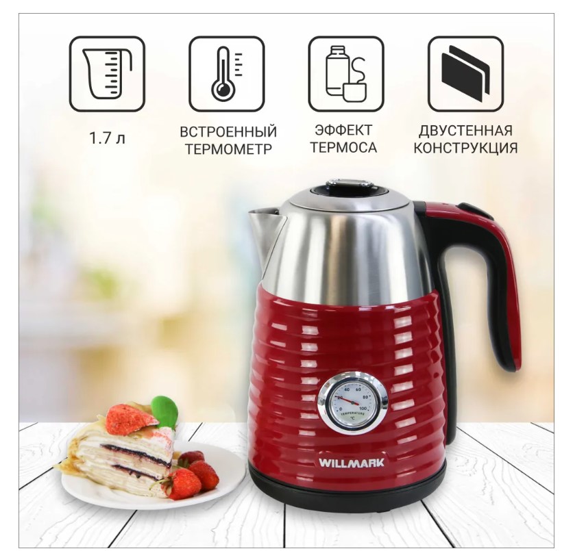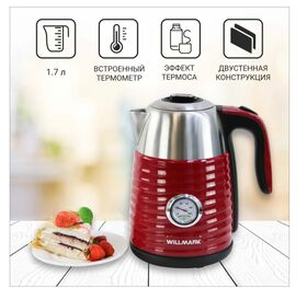 Чайник WILLMARK WEK-1738PST современный чайник с удобной ручкой, мощностью 2200Вт, объёмом 1,7 литра,с закрытым нагревательным элементом из нержавеющей стали. Удобен в эксплуатации, позволяет легко контролировать температуру воды благодаря встроенному термометру. Чайник электрический WEK-1738PST имеет двухстенную конструкцию, в которая наружняя часть выполнена из экологически безопасного пищевого пластика, внутренняя - из нержавеющей стали. Благодаря такой конструкции наружная поверхность чайника не нагревается, а при нагреве воды существенно снижается уровень шума и срок закипания. Технология термоса с двумя стенками позволит воде дольше оставаться горячей и снизит затраты на электроэнергию.