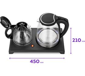 Центральный контакт для чайника на базе дает возможность ставить чайник на нее в любом положении, обеспечивая вращение на 360°. Чайник имеет защиту от перегрева и защиту от включения без воды. Кувшин для заварки изготовлен из термостойкого стекла и имеет съемный фильтр для чая или кофе. В месте установки кувшина на базу присутствует скрытый нагревательный элемент с функцией поддержания тепла. На базе расположена кнопка включения поддержания тепла, а сама база изготовлена из пластика.