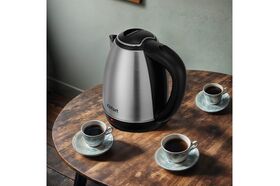 Корпус чайника выполнен из нержавеющей стали и пластика. Крышка выполнена из пластика. Внутри чайника нанесены минимальная и максимальная отметки уровня воды. Ручка чайника пластиковая.