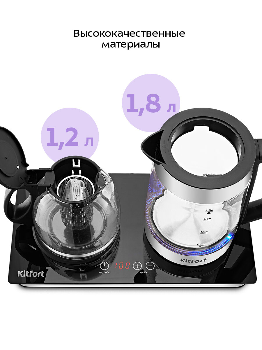 Корпус чайника ёмкостью 1,8 литра выполнен из стекла, пластика и нержавеющей стали. Заварочный чайник ёмкостью 1,2 литр изготовлен из термостойкого стекла и имеет съемный фильтр из нержавеющей стали. Оба чайника легко очищаются после использования.