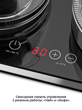 Сенсорная панель управления позволяет выбрать режим работы: «Чай» или «Кофе», выбрать температуру для режимов от 40 до 60 °С с шагом 5 °С и выключить устройство. Во время работы платформы с подогревом отображается установленная температура.