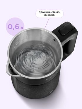 У чайника двойные стенки, благодаря чему вода будет дольше оставаться горячей. Также двойные стенки защищают от ожога, так как не сильно нагреваются. Внешняя часть чайника выполнена из пластика, а внутренняя — из нержавеющей стали.