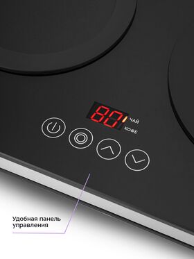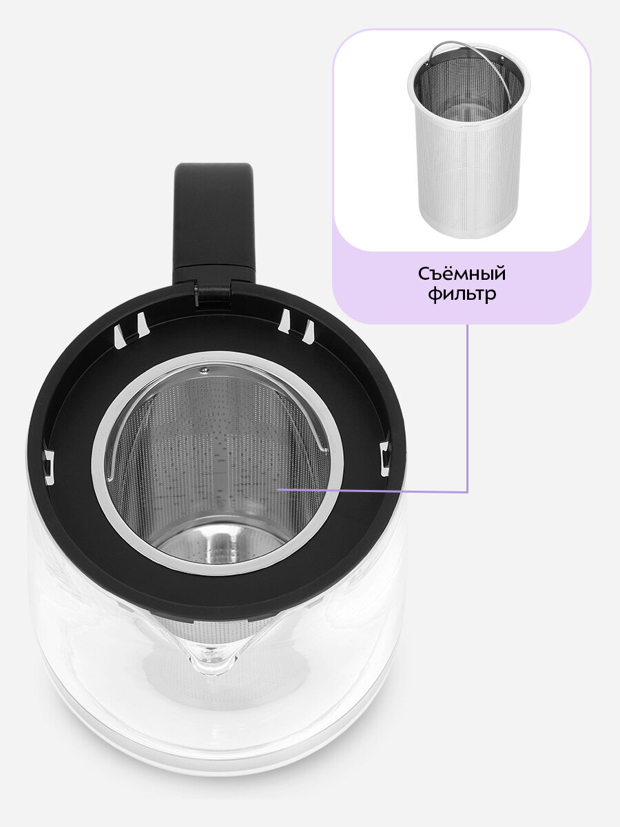 Заварочный чайник изготовлен из термостойкого стекла и имеет съёмный фильтр из нержавеющей стали для чая или кофе. В месте установки заварочного чайника на базе находится платформа с подогревом.