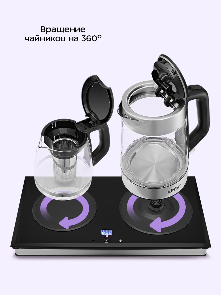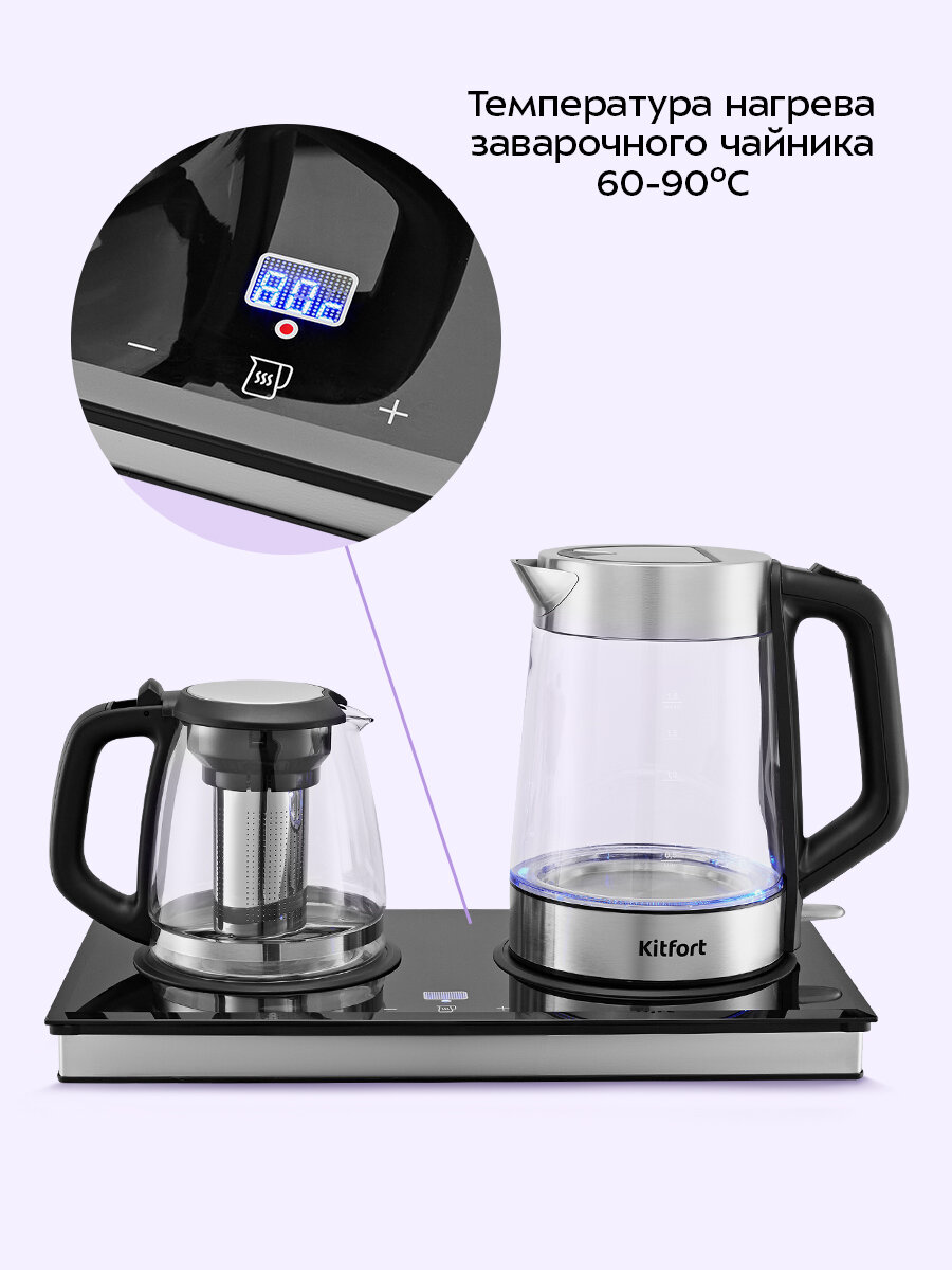 На базе устройства расположена интуитивно понятная сенсорная панель управления, позволяющая точно регулировать температуру нагрева платформы для заварочного чайника в диапазоне от 60°C до 90°C с шагом 1°C. Подогрев автоматически выключится через 24 часа.